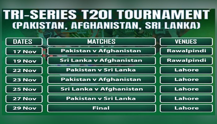 پاکستان پہلی بار ٹی ٹوئنٹی ٹرائی سیریز کی میزبانی کرے گا۔ٹرائی سیریز 17 تا 29 نومبر کو راولپنڈی اور لاہور میں ہو گی۔17 نومبر کو پہلا میچ پاکستان اور افغانستان کےمابین راولپنڈی کرکٹ سٹیڈیم میں کھیلا جائےگا،جبکہ 19نومبرکوسری لنکا اور افغانستان کی ٹیمیں بھی اسی سٹیڈیم میں مدمقابل ہوں گی۔
