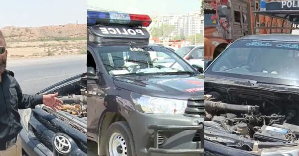 کراچی: پولیس افسر اپنے ہی ادارے کی خستہ حال پولیس موبائل میں رل گیا