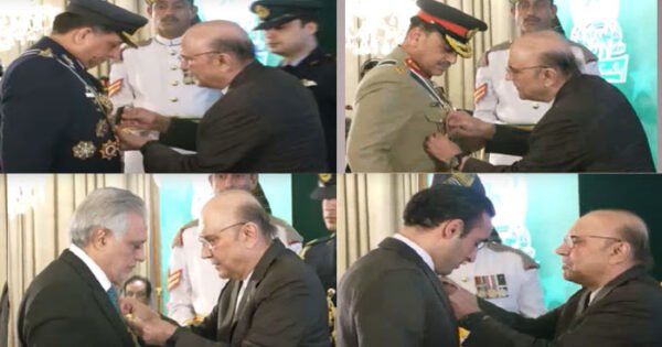 اگست 14, 2025580معرکہ حق میں بھارت کو تاریخی شکست دینے پر فیلڈ مارشل عاصم منیرکوہلالِ جرات، ائیر چیف مارشل ظہیر احمد بابر سدھو کو ہلال امتیاز جبکہ وفاقی وزرا اور چیئرمین پیپلز پارٹی کو نشان امتیاز سے نوازا گیا۔ ایوانِ صدر اسلام آباد میں ایک باوقار تقریب کے دوران صدرِ مملکت آصف ...
